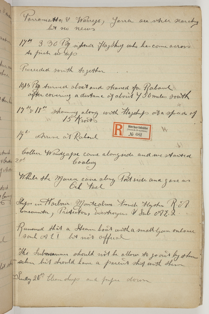 Arrive at Rabaul. Collier Wandgape came alongside and we started Coaling, while the Murex came along Port side and gave us Oil Fuel. Ships in Harbour, Montcalm French Flagship R.A. Encounter, Protector, destroyers & Sub A.E. 2. Rumoured that a Steamboat with a small Gun onboard sank A.E. 1 but not offical. The Submarines should not be allow to go out by themselves but should have a parent ship with them.