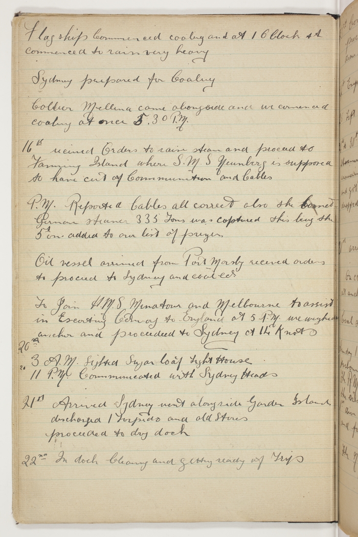 Flagship commenced coaling and at 1 O'Clock it commenced to rain very heavy. Sydney prepared for Coaling. Collier Mellina came alongside and we commenced coaling at once 5.30 P.M.