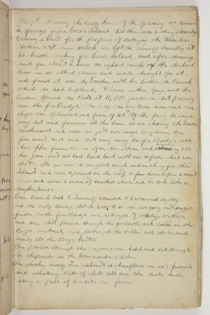 During the early hours of the Morning we received a Message from Cocos Island that there was a strange warship cruising about for the purpose of destroying the Wireless Station. At Seven o'clock we left the convoy travelling at 20 Knots making for Cocos Island, and after steaming hard for about 2 hours we sighted smoke on the starbord Bow so we altered course and made straight for it and found it was the Emden with her Collier the Buresh which she had Captured. We came within range and the Emden opened the Ball at 10,500 yards, the shot passing over the fore Bridge. The way the Captain handled the ship was splendid and from 9.40 AM the firing became very hot and furious. All this time we were chasing the Emden northward and now we got our range bring down her fore mast and and shot away away her fore Bridge and her after funnels, one after the other and silencing all her Guns but we had hard luck with our torpedo which ran short. She is now a complete wreck and making for the Island and ran aground on the reef, a few hours before a smart ship and now a mass of twisted steel and her deck like a slaughter house.