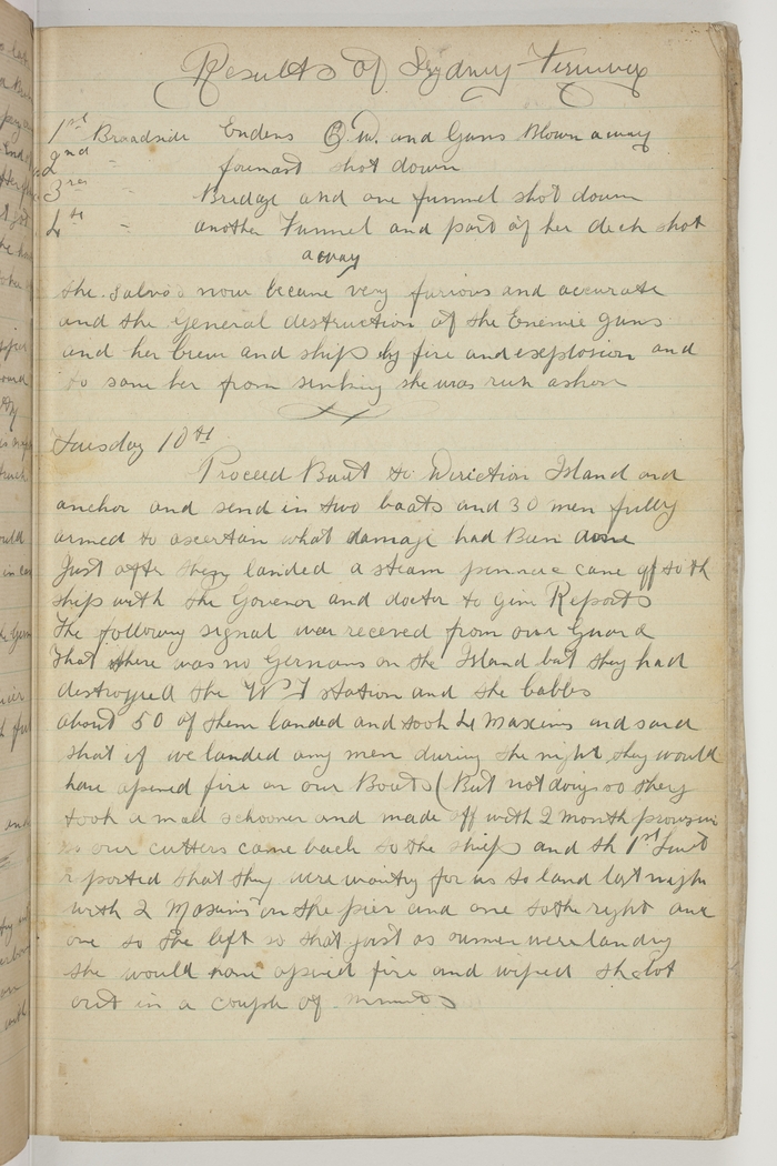 Proceed Boat to Direction Island and anchor and send in two boats and 30 men fully armed to ascertain what damage had Been done. Just after they landed a steam pinnace came off to the ship with the Governor and doctor to give Reports. The following signal was received from our Guard that there was no Germans on the Island but they had destroyed the W.T. Station and the Cables. About 50 of them landed and took 4 Maxims and said that if we landed any men during the night they would have opened fire on our Boats (But not doing so they took a small schooner and made off with 2 month provisions). So our cutters came back to the ship and the 1st. Lieut. reported that they were waiting for us to land last night with 2 Maxims on the pier and one to the right and one to the left so that just as our men were landing they would have opened fire and wiped the lot out in a couple of rounds.
