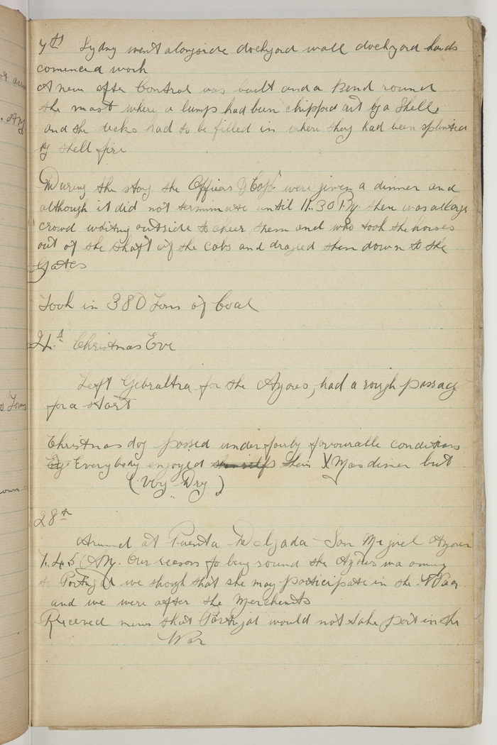 Left Gibraltra for the Azores, had a rough passage for a start. Christmas day passed under fairly favourable conditions. Everybody enjoyed themselfs their Xmas diner but (Very Dry).
