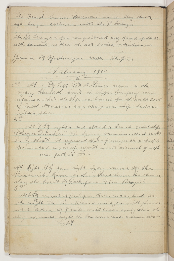 11 P.M. sighted and closed on French cabel ship "Poriyer Quartier". The Sydney communicated with her by Boat. It appeared that a passenger on a dutch steamer had made the report so not much faith was put in it. At Eight PM same night Sydney arrived off the Paramaribo River, she then altered course and steamed along the Coast of Cachipore [Cossipore] River, Brazil.