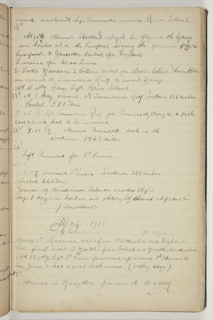 At 9 AM Admiral Stoddart struck his flag in the Sydney and hoisted it in the Liverpool. During the forenoon HMS Liverpool & Gloucester sailed for England, Louremic for Sierra Leone. E. Castle, Macedonia, 2 Colliers sailed for Abrolis, Collier Thorn Hill was ordered to Lavenderia [Lavendeira] Reef to await Sydney.