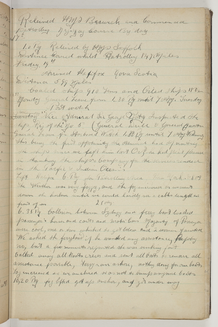 6.35 PM, 25 Aug. Collision between Sydney and ferry boat loaded passengers, horses and carts and Motor Cars. Majority of Passengers were cool, one or two whished to get below and 2 women fainted. We asked the ferryhand if he wanted any assistance, reply, No, but a few minutes reported she was sinking fast. Called away all Boats crews and sent all boats to render all assistance possible. Ferry ran ashore, nothing doing for our boats. Fog increased so we anchored so as not to bump any more boats. 10.20 PM fog lifted, got up anchor, and got under way.