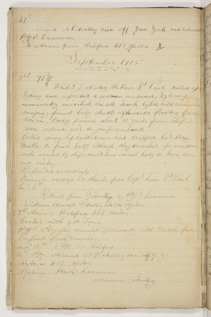 7 PM. Whilst patrolling the liner St. Paul called up Sydney and reported a woman overboard, Sydney immediately switched on all Search lights and commenced sweeping, found body shortly afterwards floating face down. Body passed about 10 yards from ship, men ordered not to jump overboard. Called away life boats crews and dropped Cal. Bouy. Unable to find body although they searched for one hour. Wake caused by ship must have caused body to turn over and sink. Reported accordingly.  Received message of thanks from Capt. Lucas, St. Paul.
