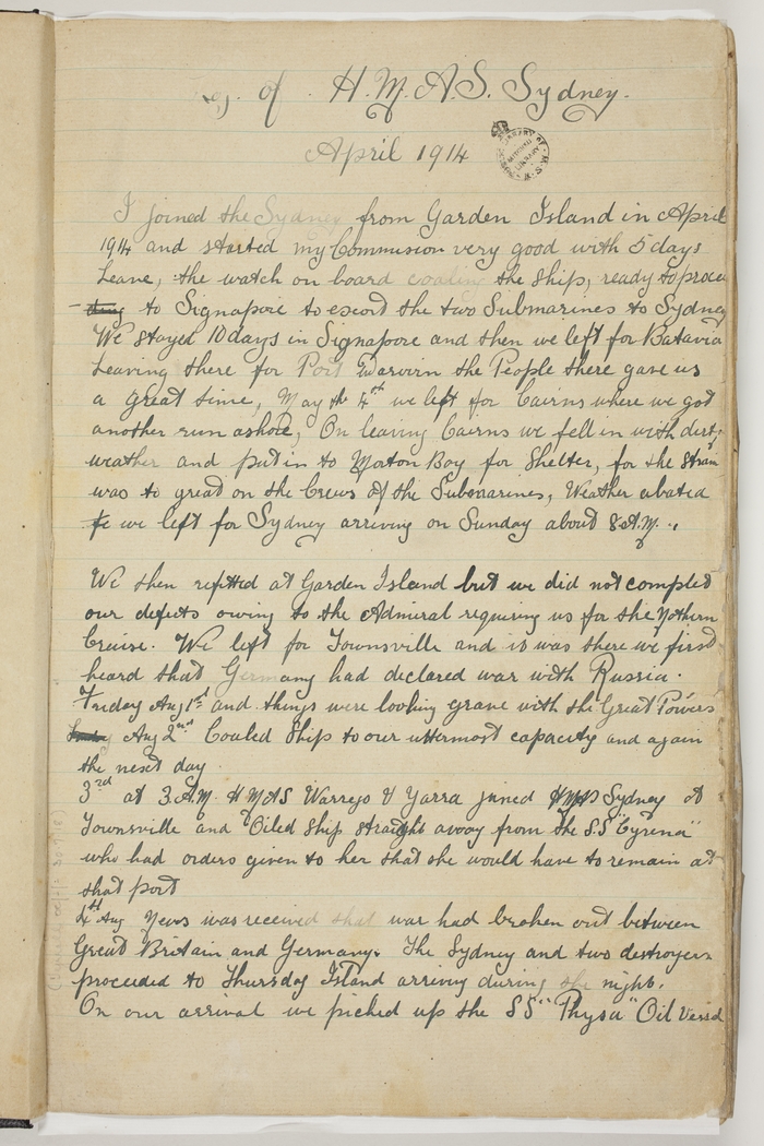 I joined the Sydney from Garden Island in April 1914 and started my Commission very good with 5 days Leave, the watch on board coaling the ship, ready to proceed to Singapore to escort the two Submarines to Sydney. We stayed 10 days in Singapore and then we left for Batavia. Leaving there for Port Darwin the People there gave us a great time. May the 4th we left for Cairns where we got another run ashore. On leaving Cairns we fell in with dirty weather and put into Morton Bay for Shelter, for the strain was to great on the Crews of the Submarines, Weather abated so we left for Sydney arriving on Sunday about 8 A.M.