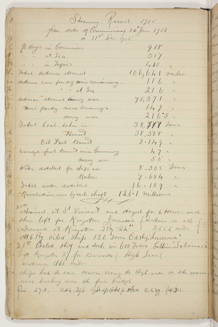 Coaled ship and took in 600 Tons, Collier "Salamanca". Left Kingston 27th for Bermuda. High Seas, Distance 1160 Miles. Ship had to ease down owing to High seas as the water was breaking over the fore Bridge. Revs. 27.8 [indecipherable] 296 Light up Boiler for Aux. 12.4 N.M. Revs 302.