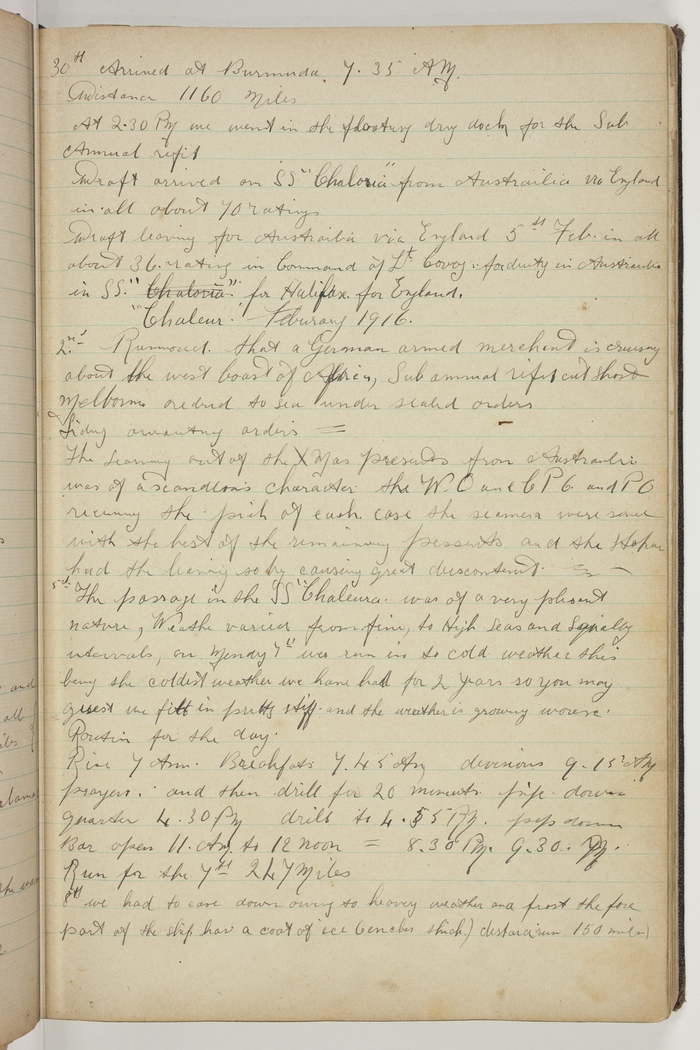 Arrived at Burmuda, [Bermuda] 7.35 AM. Distance 1160 Miles. At 2.30 PM we went in the floating dry dock for the Sub Annual Refit. Draft arrived on SS "Chaloria" from Austrailia via England in all about 70 ratings. Draft leaving for Austrailia via England 5th. Feb., in all about 36 ratings in Command of Lt. Covoy for duty in Austrailia in SS. "Chaloria" "Chaleur", for Halifax for England.