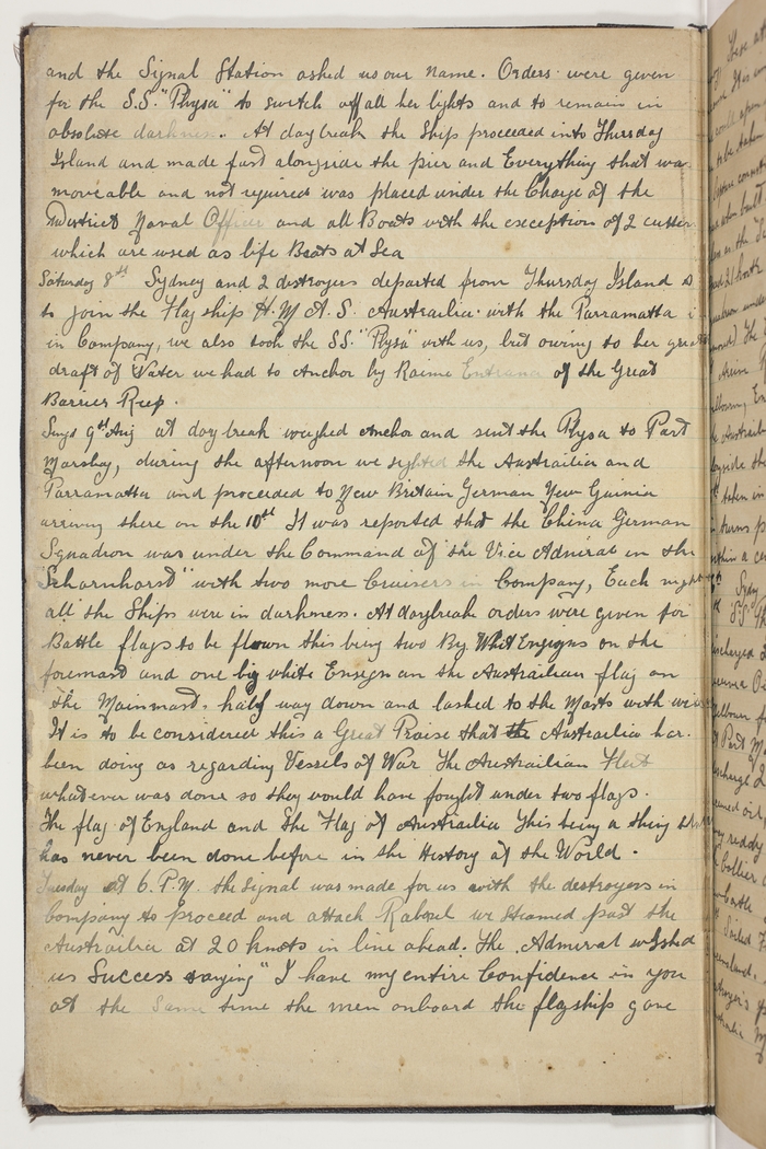 At daybreak weighed Anchor and sent the Physa to Port Morsby, during the afternoon we sighted the Austrailia and Parramatta and proceeded to New Britain, German New Guinea arriving there on the 10th. It was reported that the China German Squadron was under the Command of the Vice Admiral in the "Scharnhorst" with two more Cruisers in Company. Each night all the Ships were in darkness. At daybreak orders were given for Battle flags to be flown this being two big White Ensigns on the foremast and one big white Ensign and the Austrailian flag on the Mainmast, half way down and lashed to the Masts with wire. It is to be considered this a Great Praise that the Austrailia has been doing as regarding Vessels of War. The Austrailian Fleet whatever was done so they would have fought under two flags. The flag of England and the Flag of Austrailia. This being a thing that has never been done before in the History of the World.