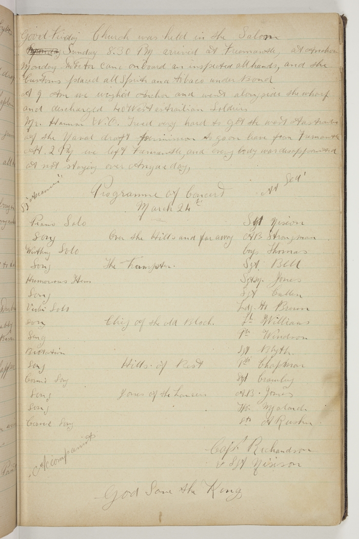 Doctor came on board and inspected all hands, and the Customs placed all Spririts and tobaco under Bond. At 9 AM. we weighed Anchor and went alongside the wharf and discharged 40 West Austrailian Soldiers. Mr. Harmon W.O. tried very hard to get the West Austrailians of the Naval draft permission to go on leave from Fremantle. At 2 PM we left Fremantle and every body was disappointed at not staying over Anzac Day.