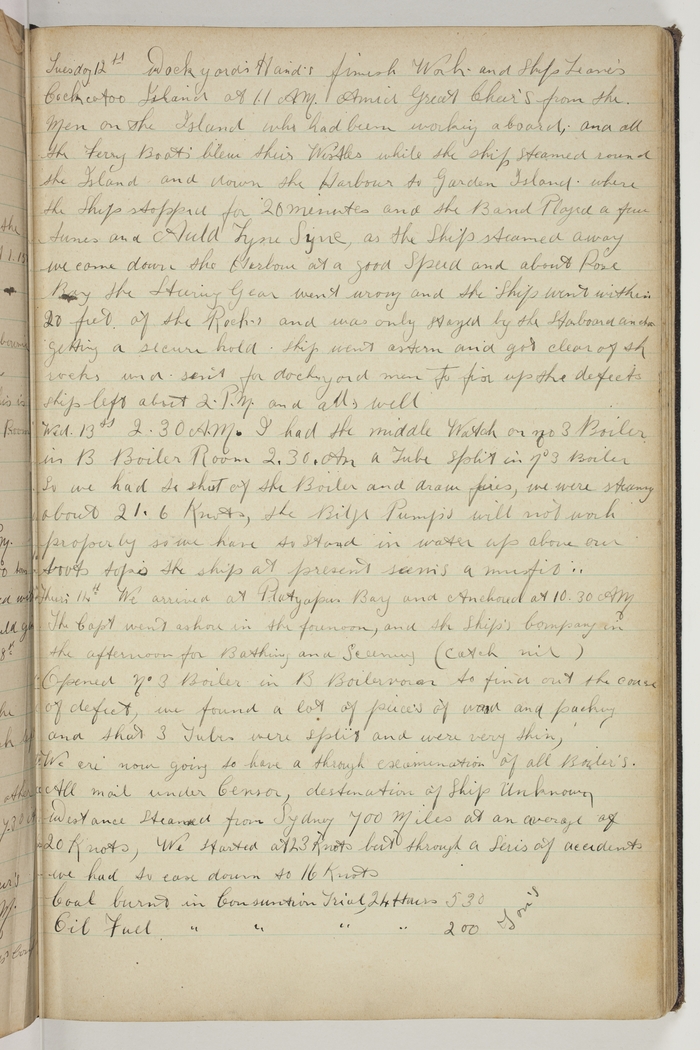 We arrived at Platyapus [Platypus] Bay and Anchored at 10.30 AM. The Capt. went ashore in the forenoon and the Ship's Company in the afternoon for Bathing [indecipherable] (catch nil). Opened No.3 Boiler in B Boiler room to find out the cause of defect, we found a lot of pieces of wood and packing and that 3 Tubes were split and were very thin. We are now going to have a through examination of all Boilers. All mail under Censor, destination of Ship Unknown. Distance steamed from Sydney 700 Miles at an average of 20 Knots. We started at 23 Knots but through a series of accidents we had to ease down to 16 Knots.