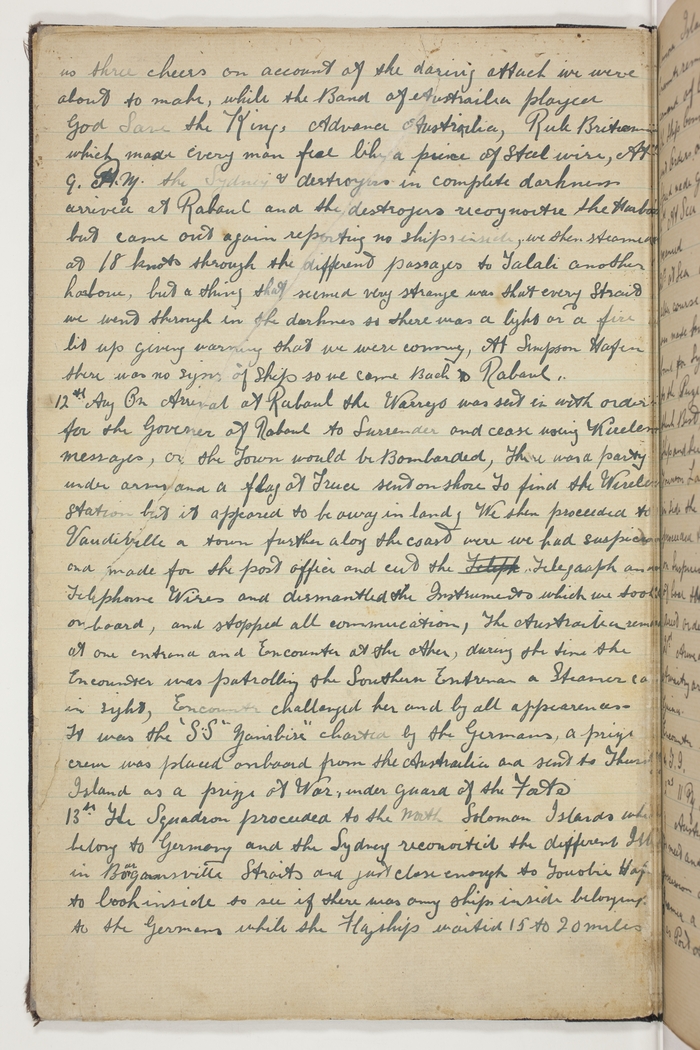 On arrival at Rabaul the Warrego was sent in with orders for the Governer of Rabaul to Surrender and cease using Wireless messages, or the Town would be Bombarded, There was a party under arms and a flag of Truce sent on shore to find the Wireless station but it appeared to be away in land. We then proceeded to Vaudiville [?] a town further along the coast were we had suspicions and made for the post office and cut the Telegraph and Telephone Wires and dismantled the Instruments which we took on board, and stopped all communication. The Austrailia remained at one entrance and Encounter at the other, during the time the Encounter was patrolling the Southern Entrance a Steamer came in sight, Encounter challenged her and by all appearances It was the S.S."Zanibise" charted by the Germans, a prize crew was placed onboard from the Austrailia and sent to Thursday Island as a prize of War, under guard of the [Fate?]