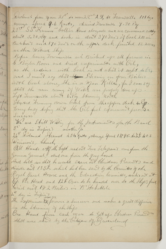 Distance Steamed 254 Knots, Average Speed 13.95 to T.S. 403. Divisions, Church. All Hands Aft the Capt. read out Two Telegrams one from the Govenor General, and one from the Navy board, and told us that he would serve out Christmas Presents and divide out 135£ which had been sent by the Committe of the Royal Naval House and the Education Committe, works out 6/- Per Head and 12£ over to be handed over to the Ship's fund. Dried out 1 & 2 Boilers in "B" Stokehole. 4th Day Tropics. The experiment with Oil proves a Success and makes a great difference in the Steaming of the Ship. One Hand from each Mess to Get up Christmas Presents that were sent by the Citizens of Queensland.
