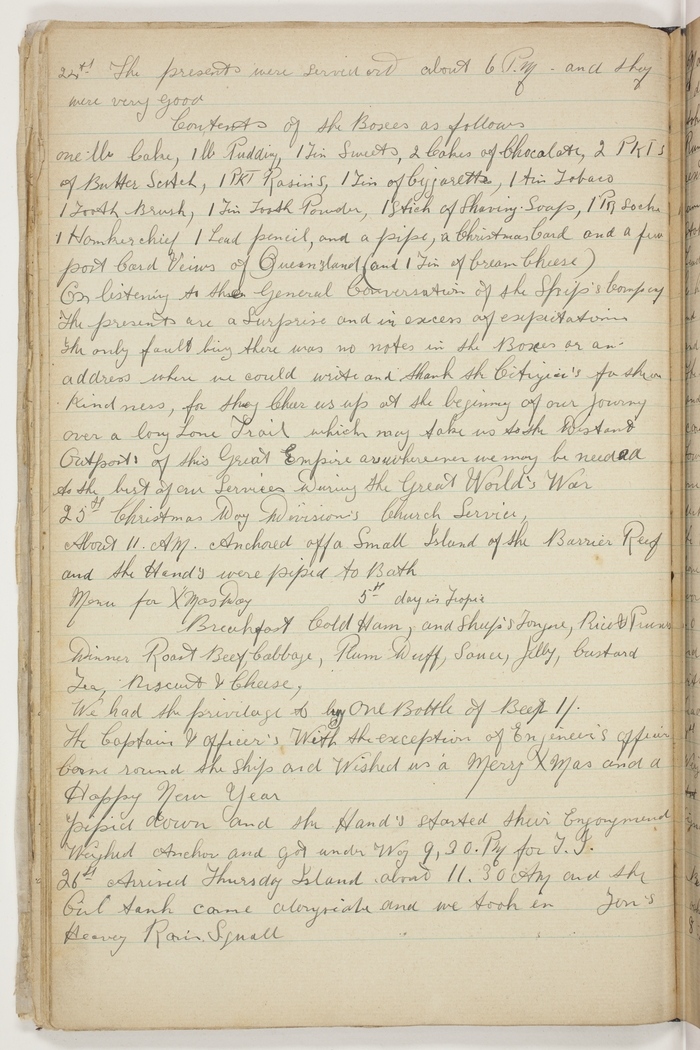 The presents were served at about 6 PM and they were very good. Contents of the Boxes as follows: one lb Cake, 1lb. Pudding, 1 Tin Sweets, 2 Cakes of Chocolate, 2 Pkts. of Butter Scotch, 1 PKT Raisins, 1 Tin of Cigarettes, 1 tin tobaco, 1 Tooth Brush, 1 Tin Tooth Powder, 1 Stick of Shaving Soap, 1 PR Socks, 1 Hankerchief, 1 Lead pencil, and a pipe, a Christmas Card and a few post Card Views of Queensland (and 1 Tin of Cream Cheese). On listening to the General Conversation of the Ship's Company the presents are a Surprise and in excess of expectations. The only fault being that there was no notes in the Boxes or an address where we could write and thank the Citizens for their kindness, for they Cheer us up at the beginning of our Journey over a long Lone Trail which may take us to the Distant Outposts of this Great Empire or wherever we may be needed to the best of our Services during the Great World's War.