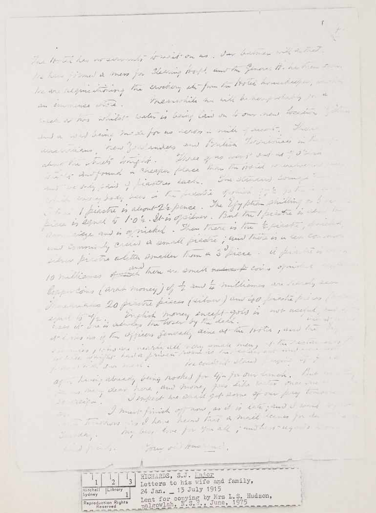 The Hotel has no servants to wait on us. Our batmen will do that. We have formed a mess for Clearing Hospl. [Hospital] and the General H]ospital] has their own. We are requisitioning the crockery etc from the Hotel housekeeper, who has an immense store. Meanwhile we will be here probably for a week or two whilst water is being laid on to our new location Zeitoun and a road being made for us across a mile of desert. There are Australians, New Zealanders and British Territorials in throngs about the streets tonight. Three of us went out at 7 o'clock tonight and found a cheaper place than the Hotel where we had lunch and we only paid 9 piastres each. The standard coinage here and which every body uses is the piastre of which 97½ go to a [indecipherable] 1 piastre is about 2½ pence. The Egyptian shilling or 5 piastre piece is equal to 1.0½ [shilling & a halfpenny]. It is of silver. But the 1 piastre is about the same size and is of nickel. Then there is the ½ piastre, of nickel, and commonly called a small piastre; and there is a less common silver piastre a little smaller than a 3d [penny] piece. A piastre is worth 10 milliemes of which and there are small coins of nickel less common. Copper coins (arab money) of ½ and ¼ milliemes are rarely seen. There are also 20 piastre pieces (silver) and 40 piastre pieces (dollars) equal to 4/2 [shillings & pence]. English money except gold is not useful, and if one uses it one is always the loser by the deal. About meals it looks as if the Officers generally dine at the Hotel, and the English Tommies, who are nearly all very small men, at the restaurants. But we three tonight had a private room at the restaurant and were well pleased with our meal. We couldn't stand paying 6/- [shillings] for a dinner after having already being rooked for 4/- [shillings] for our lunch. But everything seems very dear here, and money goes like water once one changes a sovereign! I expect we shall get some of our pay tomorrow or so. I must finish off now, as it is late; and I want to post letter tomorrow as I have heard that a mail leaves for Australia on Tuesday. My best love for you all; and best regards to our kind friends.