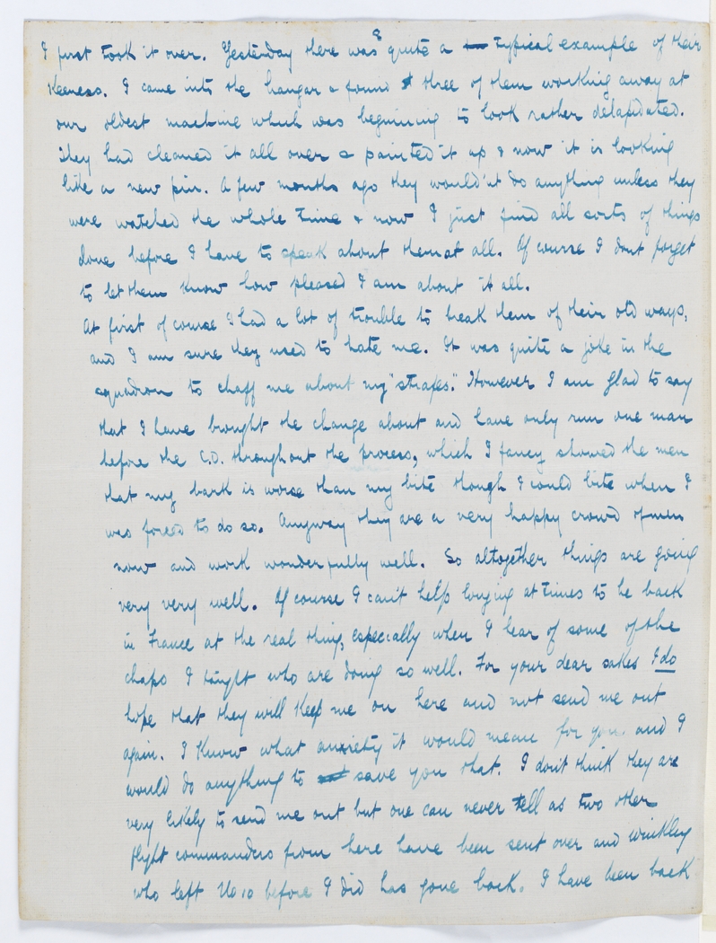 At first of course I had a lot of trouble to break them of their old ways, and I am sure they used to hate me. It was quite a joke in the squadron to chaff me about my "strafes". However I am glad to say that I have brought the change about and have only run one man before the C.O. throughout the process, which I fancy showed the men that my bark is worse than my bite though I could bite when I was forced to do so. Anyway they are a very happy crowd of men now and work wonderfully well. So altogether things are going very very well. Of course I can't help longing at times to be back in France at the real thing, especially when I hear of some of the chaps I taught who are doing so well. For your dear sakes I do hope that they will keep me on here and not send me out again. I know what anxiety it would mean for you and I would do anything to save you that. I don't think they are very likely to send me out but one can never tell as two other flight commanders from here have been sent over and Winkley who left No 10 before I did has gone back. I have been back