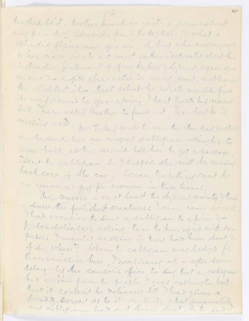 The censors – or at least the Sydney variety of them – seem the foolishest creatures I ever came across. I had occasion to send a cablegram to a firm of London solicitors asking them to hurry up with some papers I wanted, & asking if they had been sent, & if so, when? When the cablegram was lodged for transmission here, I was rung up – after some delay – by the censor's office to say that a cablegram had arrived from the people I was cabling to, but that it couldn't be delivered till I had given a bond of secrecy as to its contents, & that meanwhile my cablegram had not been sent. In the end I