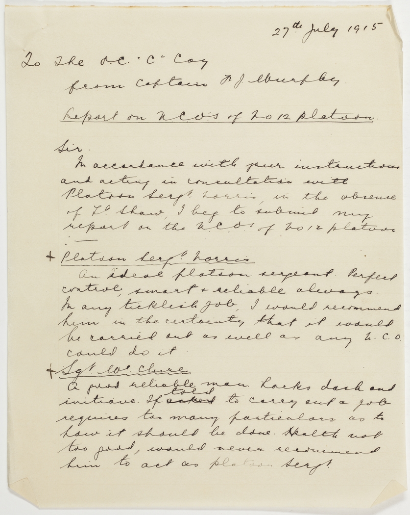 In accordance with your instructions and acting in consultation with Platoon Sergt. Norris, in the absence of Lt. Shaw, I beg to submit my report on the N.C.O.s of No 12 platoon