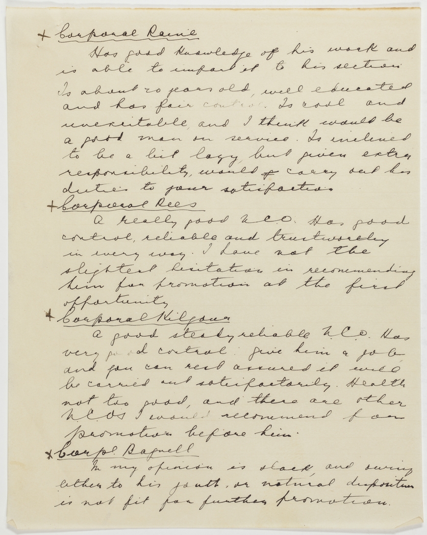 A really good N.C.O. Has good control, reliable and trustworthy in every way. I have not the slightest hesitation in recommending him for promotion at the first opportunity
