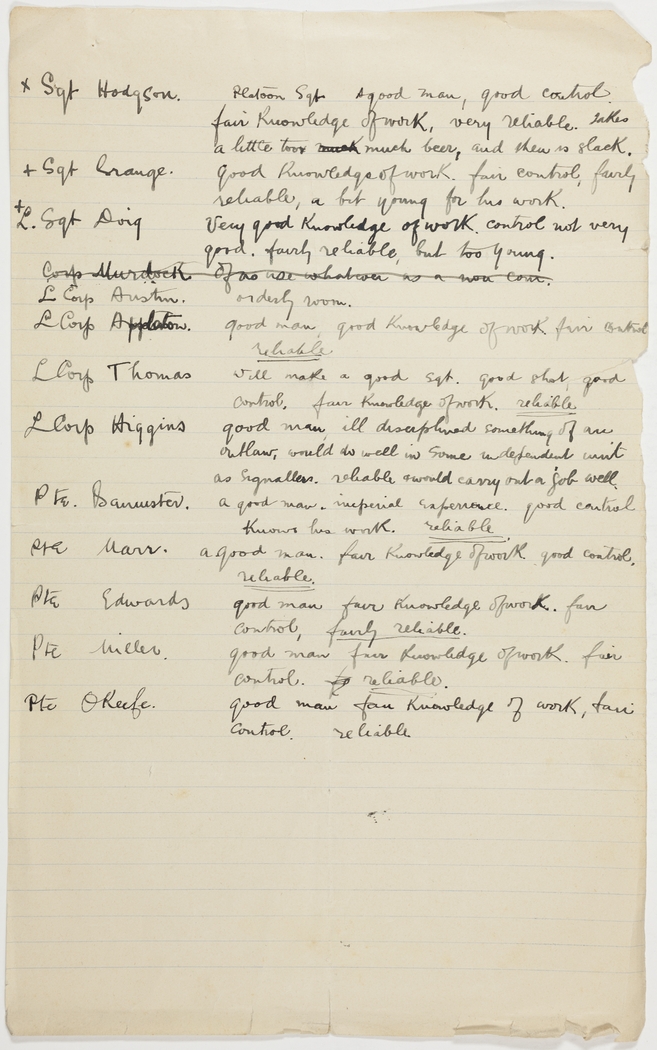 X Sgt Hodgson. Platoon Sgt. A good man, good control. fair knowledge of work, very reliable. Takes a little too muck much beer, and then is slack.