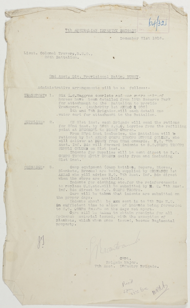 From 23rd inst inclusive, the Battalion will be rationed by 1st ANZAC CORPS TROOPS SUPPLY COLUMN, who will deliver at BUSSY from 22nd onwards. H.Q. 7th Aust. Inf. Bde will forward indents to S.O. CORPS TROOPS SUPPLY COLUMN on 21st inst.