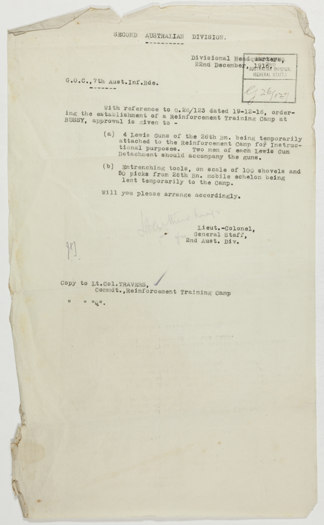 (a) 4 Lewis Guns of the 26th Bn. being temporarily attached to the Reinforcement Camp for Instructional purposes. Two men of each Lewis Gun Detachment should accompany the guns.