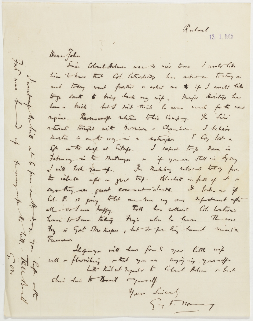 Since Colonel Holmes was so nice to me I would like him to know that Col. Pethebridge has asked me to stay on and today went further & asked me to if I would like to go south to bring back my wife. Major Heritage has been a brick but I don't think he cares much for the new regime. Ravenscroft returns to his Company. The "Siar" returns tonight with Morrison & Chambers- I believe Martin is on the way in a destroyer E. Coy lost a Sgt in the surf at Litape. I expect to go down in February in the Matunga & if you are still in Sydney I will look you up. The Meklong returns today from the island after a great trip. Blackett is full of it & says they are great coconuts islands. It looks as if Col. P. is going to let me have my own department after all so I am happy. [Tull?] has collared Col Watson's house so I am taking Fry's when he leaves. [indecipherable] Fry is Govt. Store Keeper, but so far they haven't [raised?] a Treasurer.