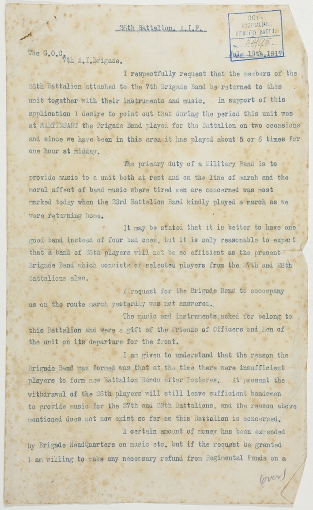 I respectfully request that the members of the 26th Battalion attached to the 7th Brigade Band be returned to this unit together with their instruments and music. In support of this application I desire to point out that during the period this unit was at MARTINSART the Brigade Band played for the Battalion on two occasions and since we have been in this area it has played about 5 or 6 times for one hour at midday.