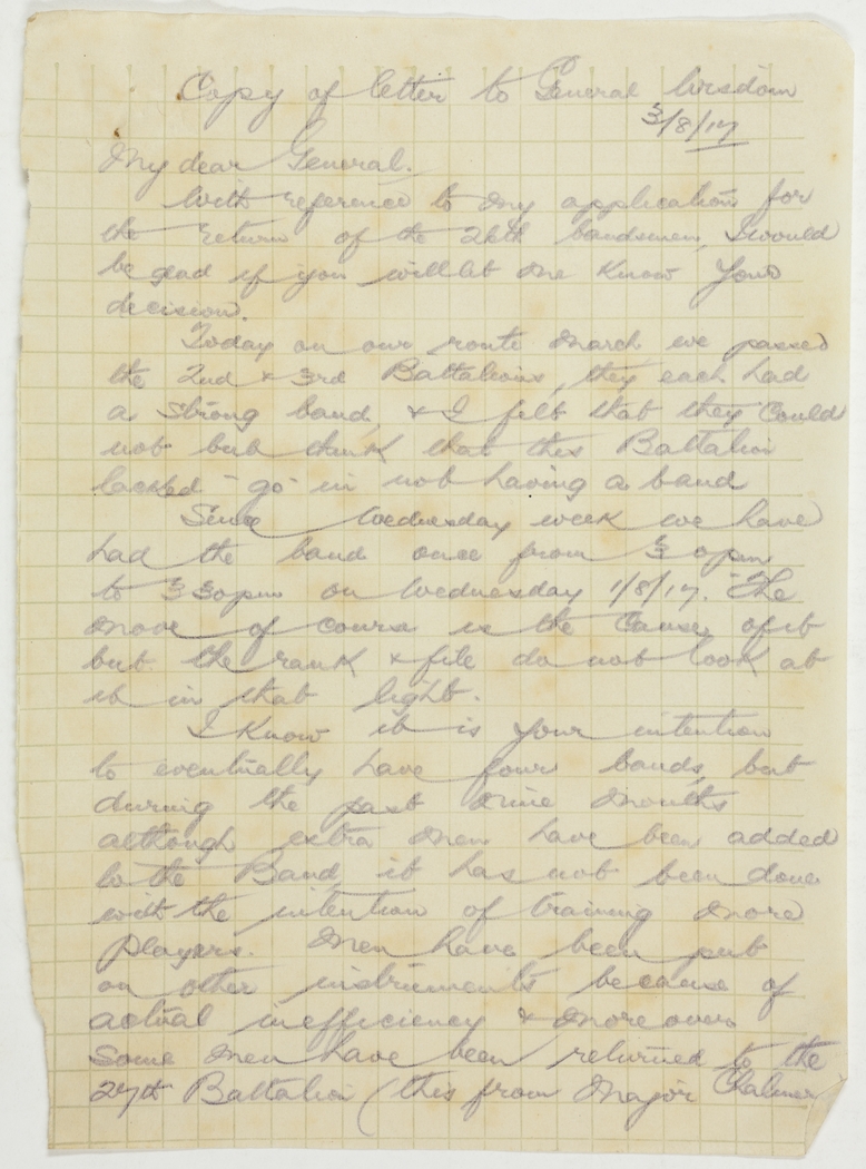 I know it is your intention to eventually have fewer bands, but during the past nine months although extra men have been added to the Band, it has not been done with the intention of training more players. Men have been put on other instruments because of actual inefficiency & moreover some men have been returned to the 27th Battalion (this from Major Chalmers