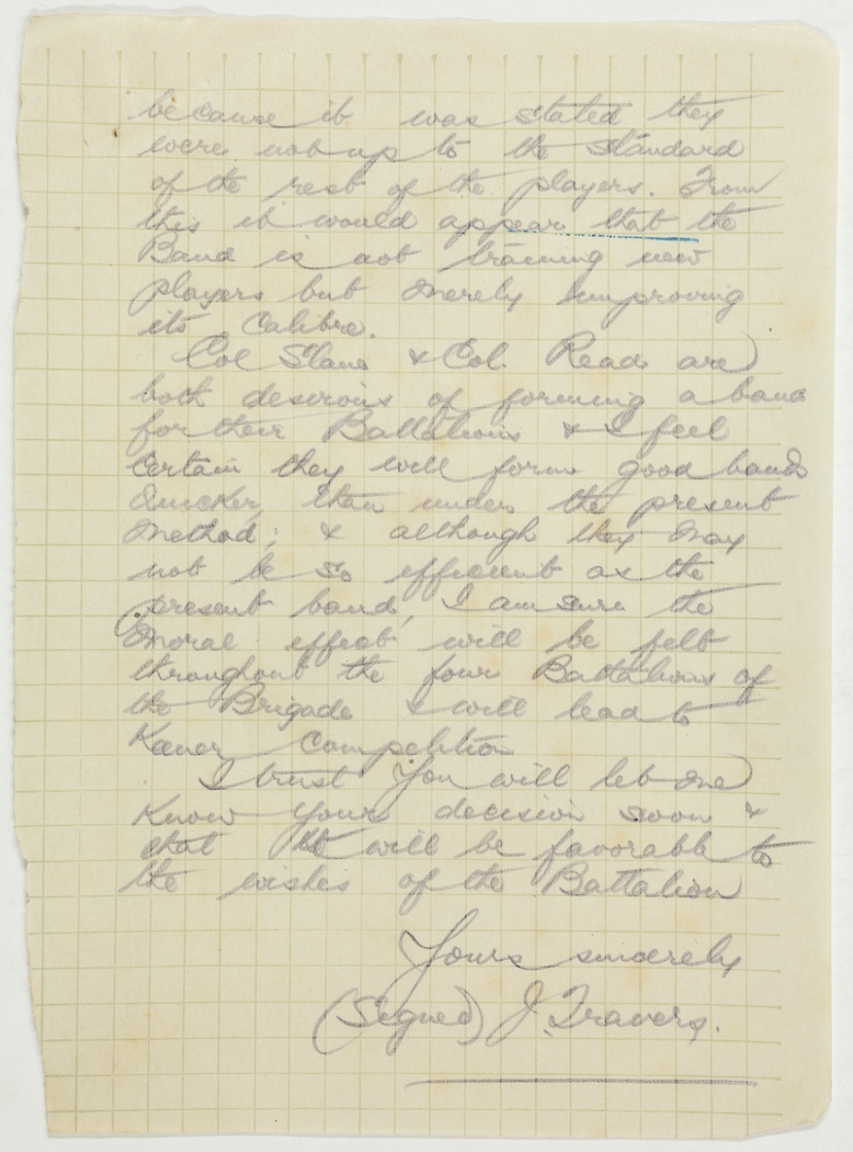 Col [Slane?] & Col. Read are both desirous of forming a band for their Battalions & I feel certain they will form good bands quicker, than under the present method; & although they may not be so efficient as the present band, I am sure the moral effect will be felt throughout the four Battalions of the Brigade & will lead to keener competition