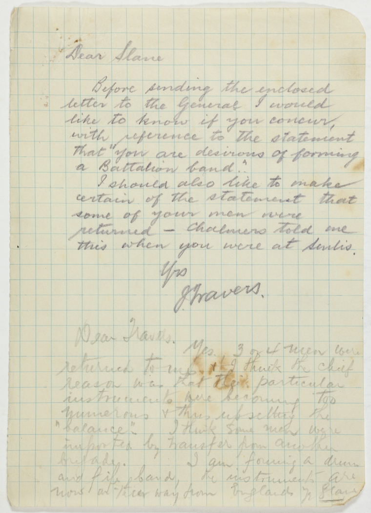 Yes., 3 or 4 men were returned to us & I think the chief reason was that their particular instruments were becoming too numerous & thus upsetting the "balance". I think some men were imported by transfer from another brigade. I am forming a drum and fife band, the instruments are now on their way from England