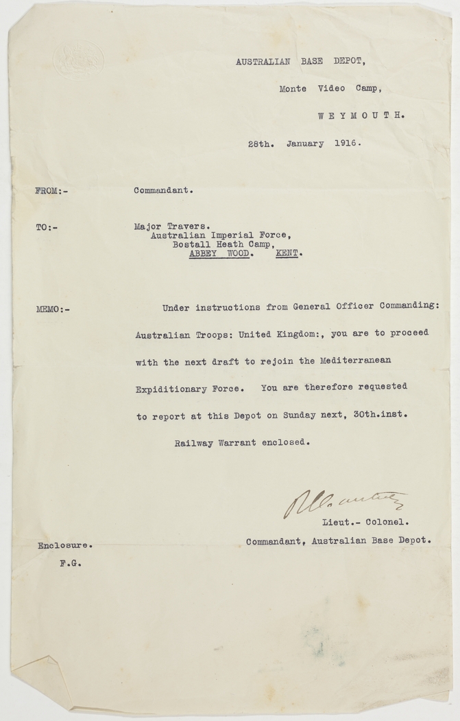 Memo:- Under instructions from General Officer Commanding: Australian Troops: United Kingdom:, you are to proceed with the next draft to rejoin the Mediterranean Expiditionary Force. You are therefore requested to report at this Depot on Sunday next, 30th. inst.