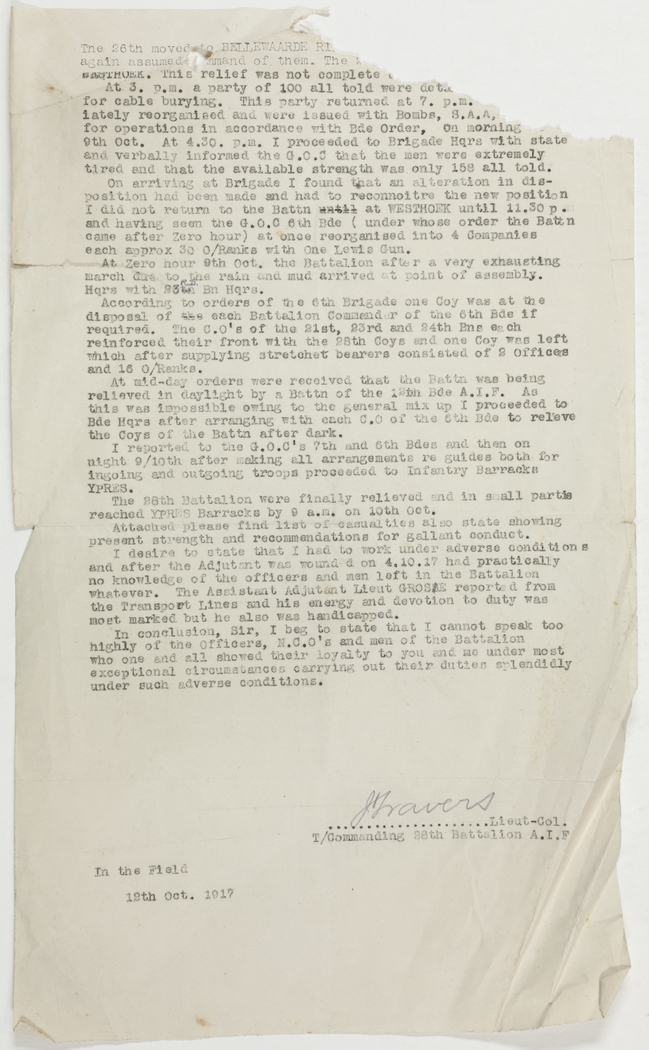 I desire to state that I had to work under adverse conditions and after the Adjutant was wounded on 4.10.17 had practically no knowledge of the officers and men left in the Battalion whatever. The Assistant Adjutant Lieut Grose reported from the Transport Lines and his energy and devotion to duty was most marked but he also was handicapped.