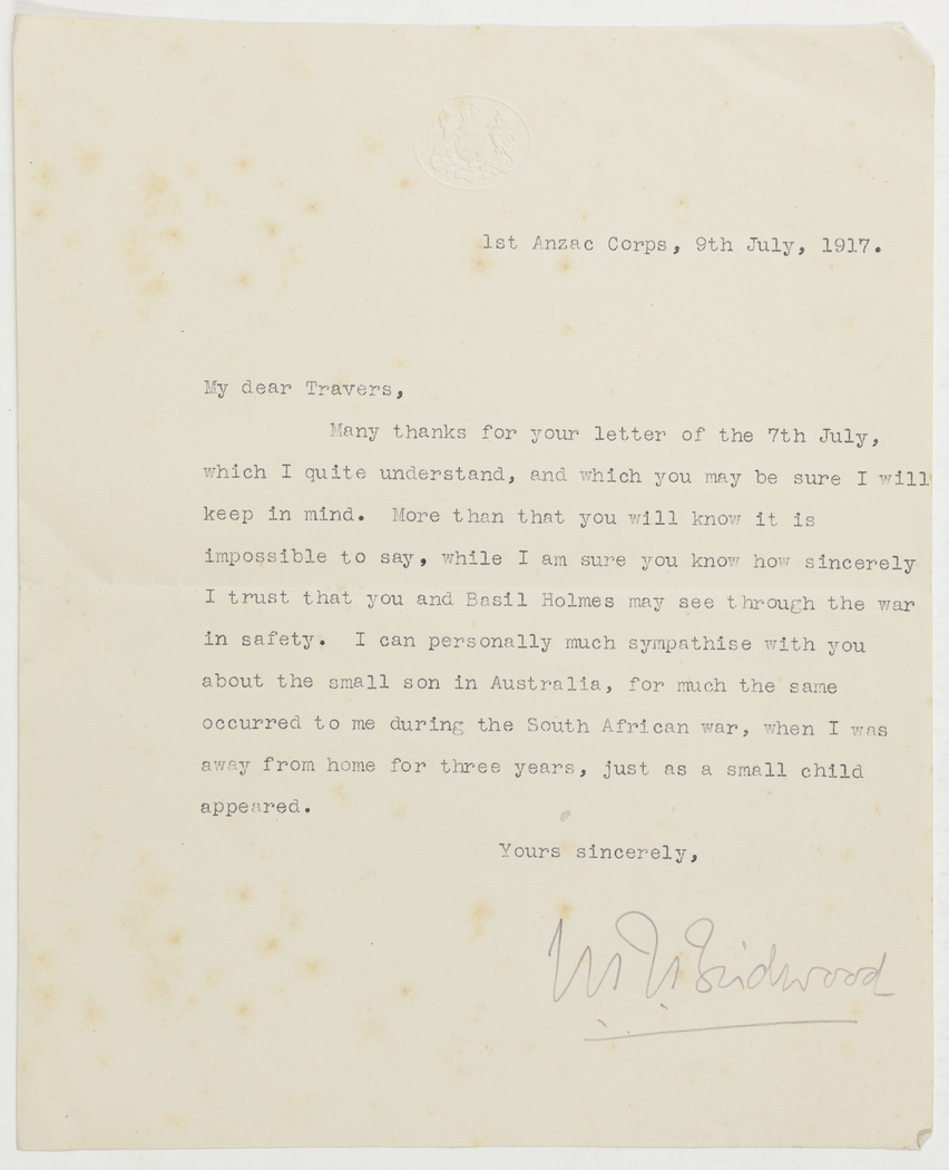 Many thanks for your letter of the 7th July, which I quite understand, and which you may be sure I will keep in mind. More than that you will know it is impossible to say, while I am sure you know how sincerely I trust that you and Basil Holmes may see through the war in safety. I can personally much sympathise with you about the small son in Australia, for much the same occurred to me during the South African war, when I was away from home for three years, just as a small child appeared.