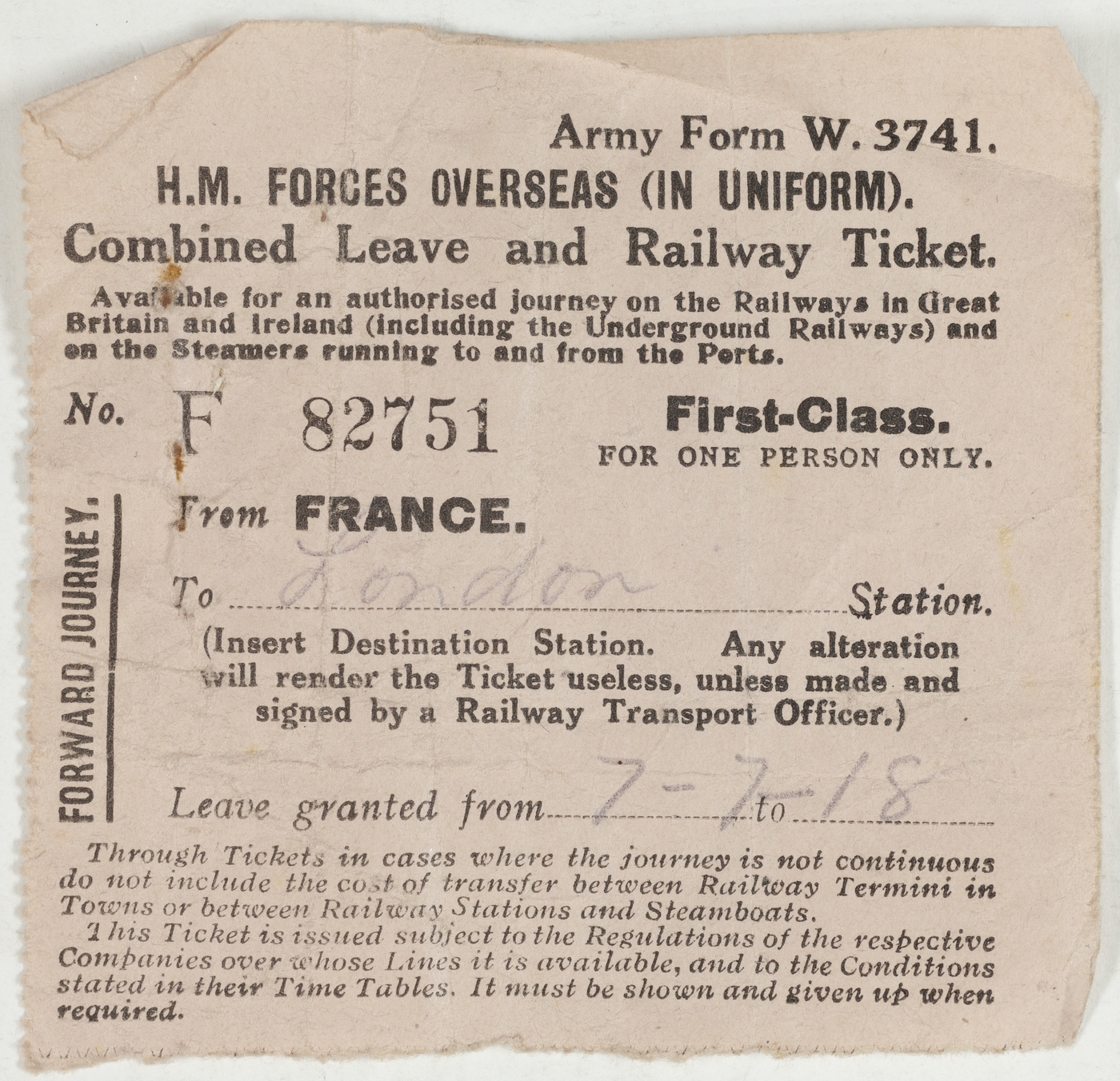 H.M. Forces Overseas (In Uniform) Combined Leave and Railway Ticket, First Class, for one person only