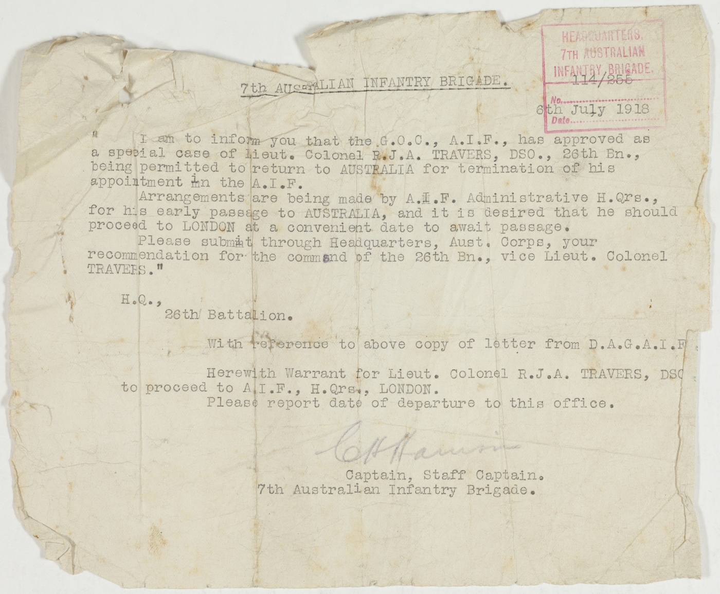 "I am to inform you that the G.O.C., A.I.F., has approved as a special case of Lieut. Colonel R.J.A. Travers, DSO., 26th Bn., being permitted to return to Australia for termination of his appointment in the A.I.F.