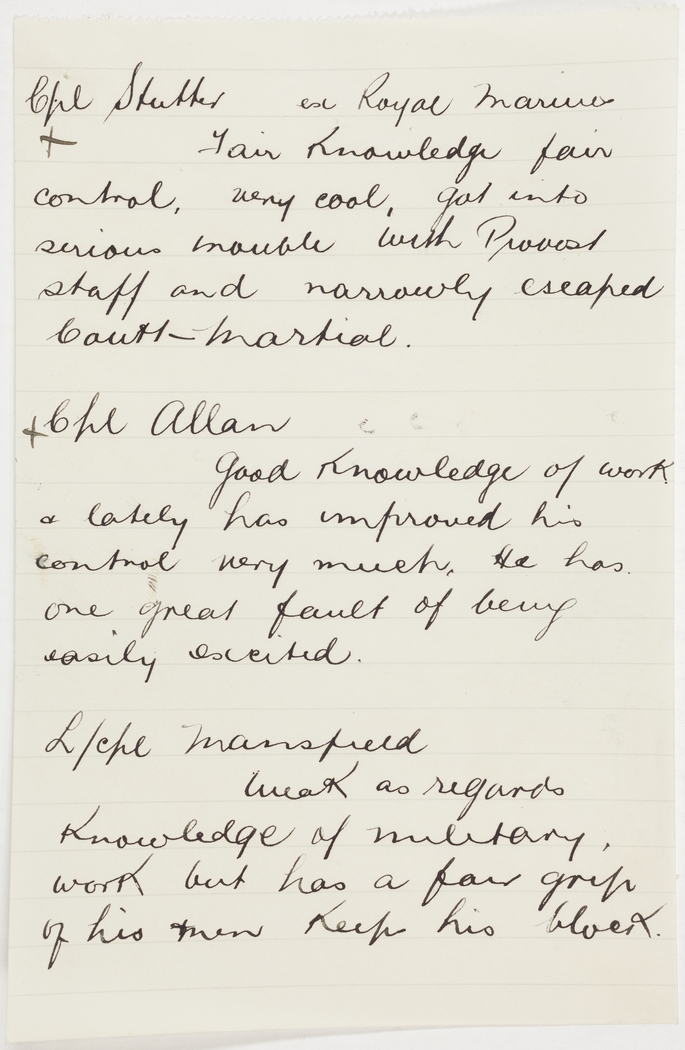 Weak as regards Knowledge of military work but has a fair grip of his men Keeps his [block?].