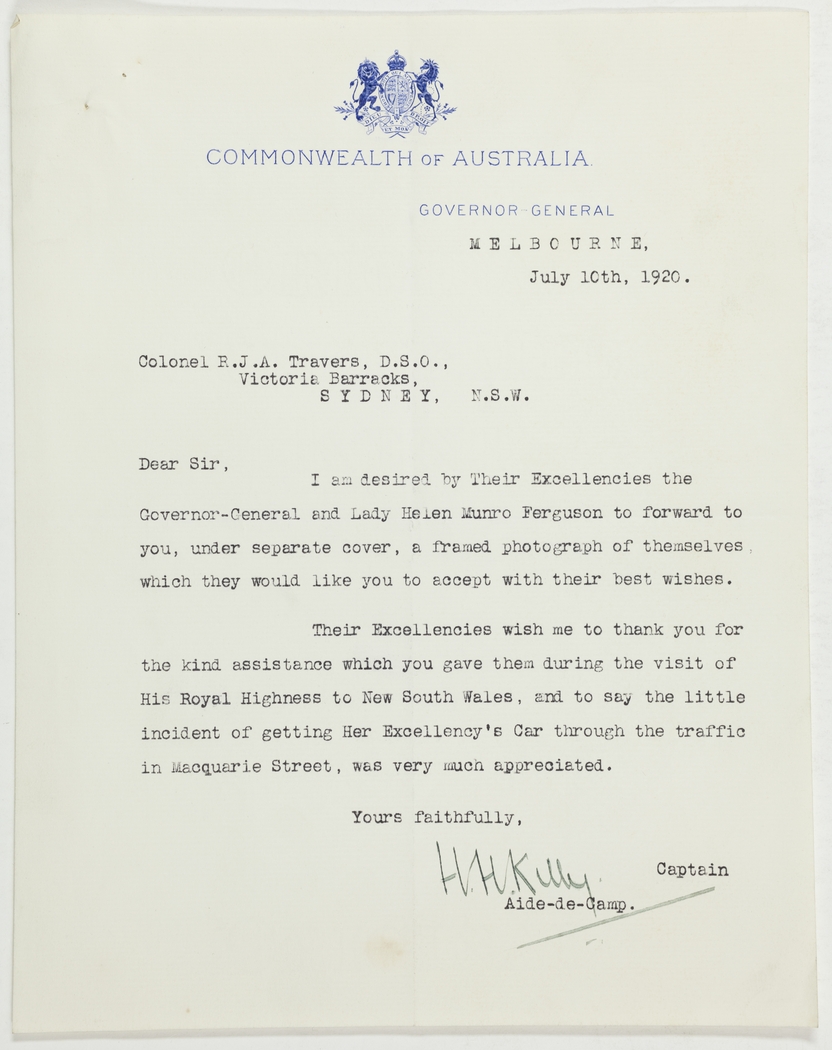 Their Excellencies wish me to thank you for the kind assistance which you gave them during the visit of His Royal Highness to New South Wales, and to say the little incident of getting Her Excellency's Car through the traffic in Macquarie Street, was very much apprciated.