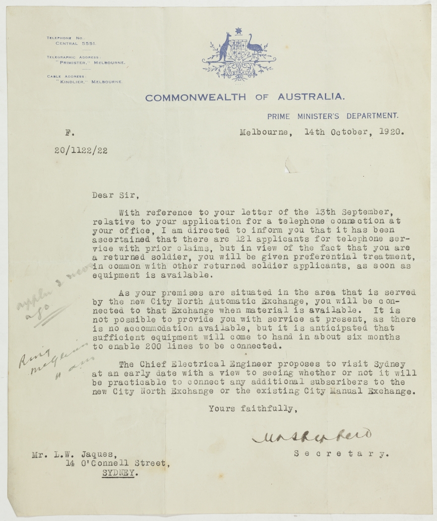 With reference to your letter of the 13th September, relative to your application for a telephone connection at your office, I am directed to inform you that it has been ascertained that there are 121 applicants for telephone service with prior claims, but you will be given preferential treatment, in common with other returned soldier applicants, as soon as equipment is available.