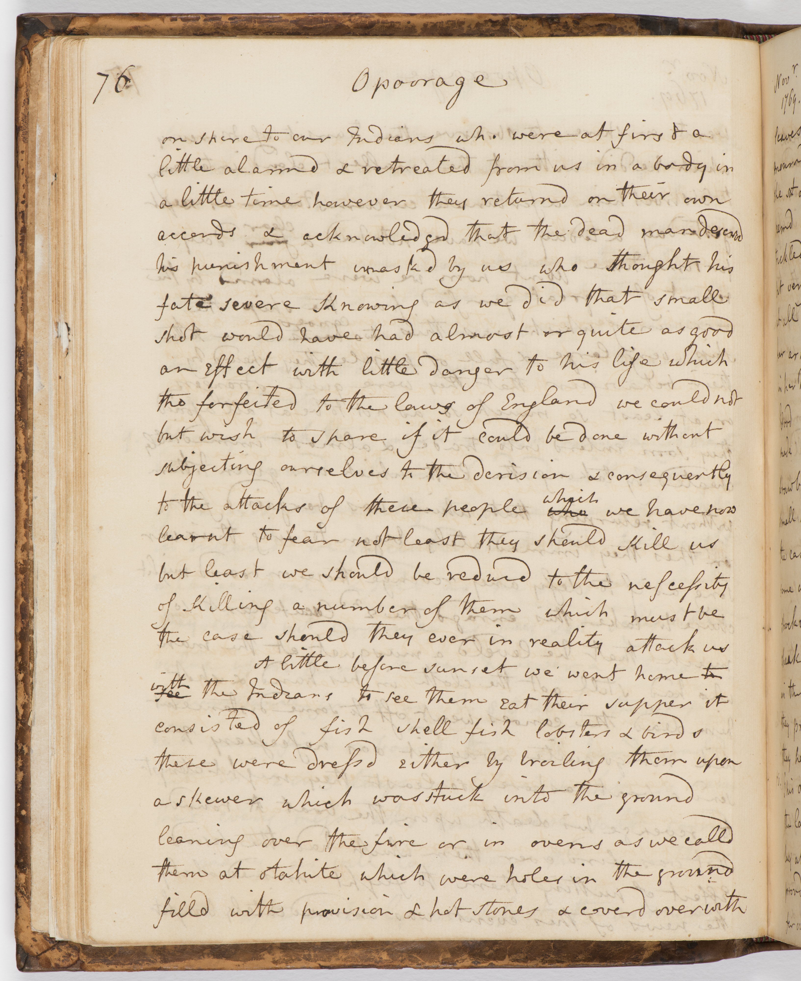 A little before sunset we went home to see with the Indians to see them eat their supper it consisted of fish shell fish lobsters & birds these were dressd either by broiling them upon a skewer which was stuck into the ground leaning over the fire or in ovens as we calld them at otahite which were holes in the ground filld with provision & hot stones & coverd over with