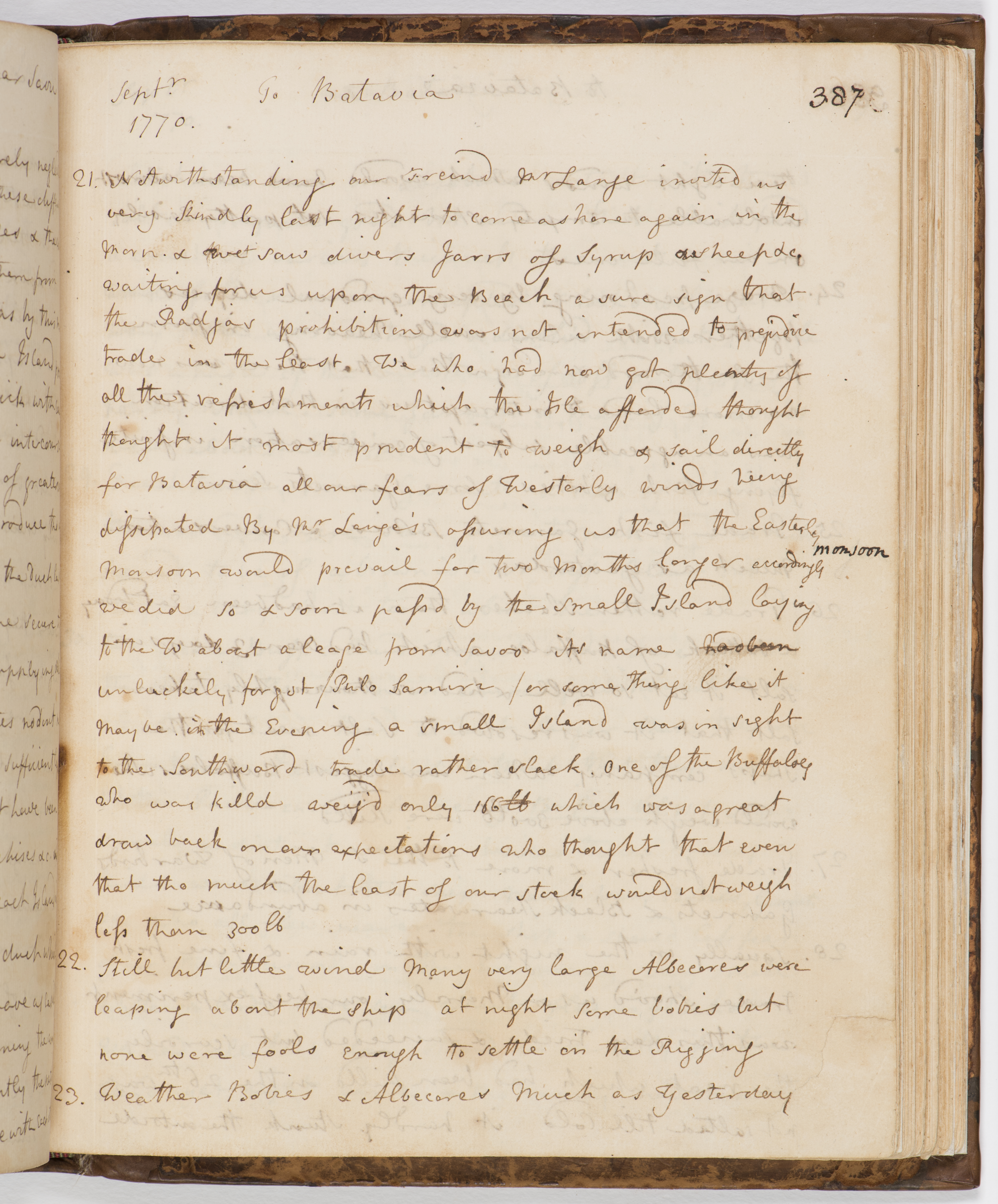 Mr Lange's assuring us that the Easterly Monsoon would prevail for two Months longer accordingly we did so & soon passd by the small Island laying to the W about a leage from Savoo its name has been unluckily forgot (Pulo Samiri) or some thing like it may be in the Evening a small Island was in sight to the Southward trade rather slack. One of the Buffaloes who was killd weig'd only 166 lb which was a great draw back on our expectations who thought that even that tho much the least of our stock would not weigh less than 300 lb