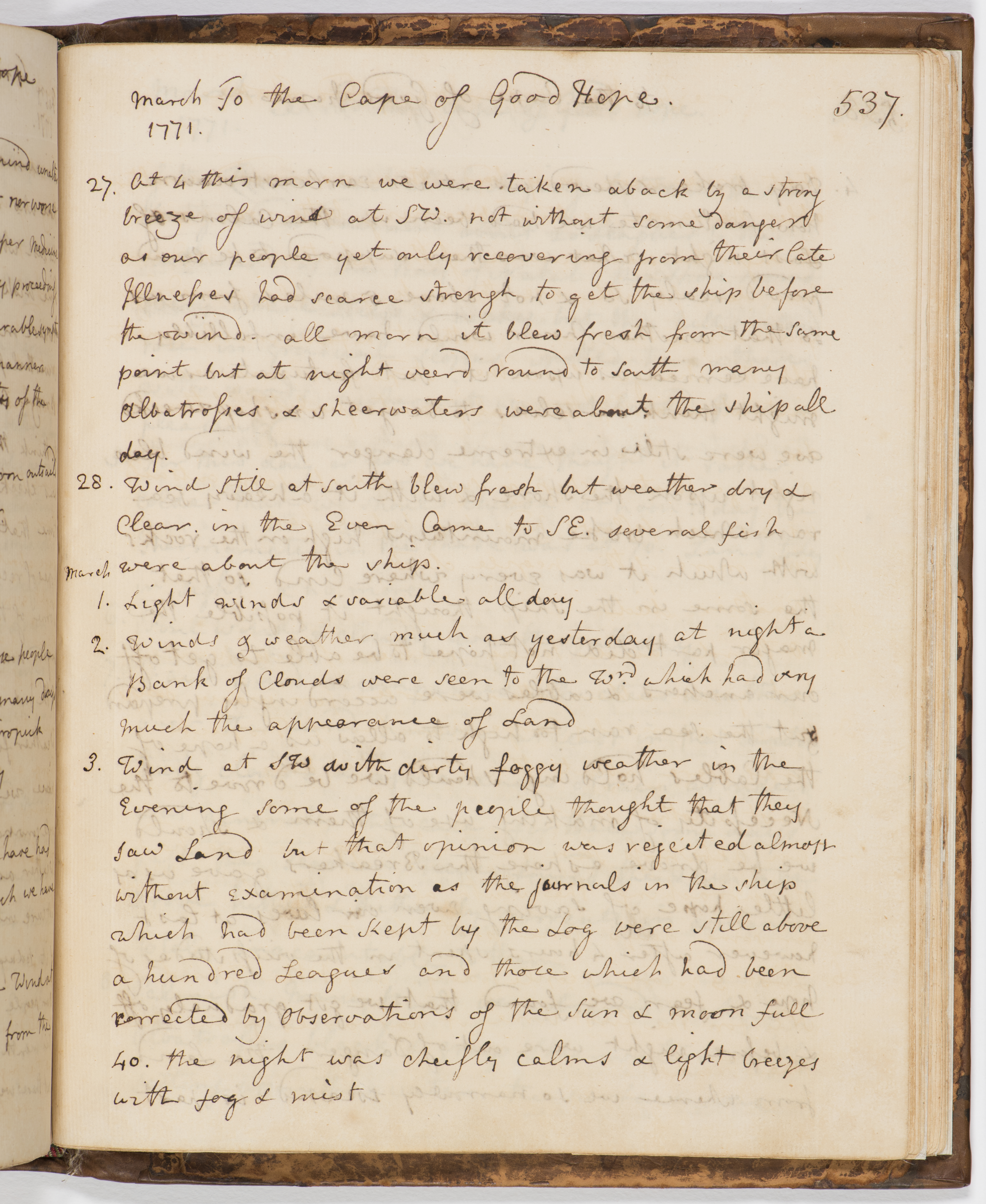3. Wind at SW with dirty foggy weather in the evening some of the people thought that they saw Land but that opinion was rejected almost without examination as the journals in the ship which had been kept by the Log were still above a hundred Leagues and those which had been corrected by Observations of the Sun & Moon full 40. the night was cheifly calms & light breezes with fog & mist