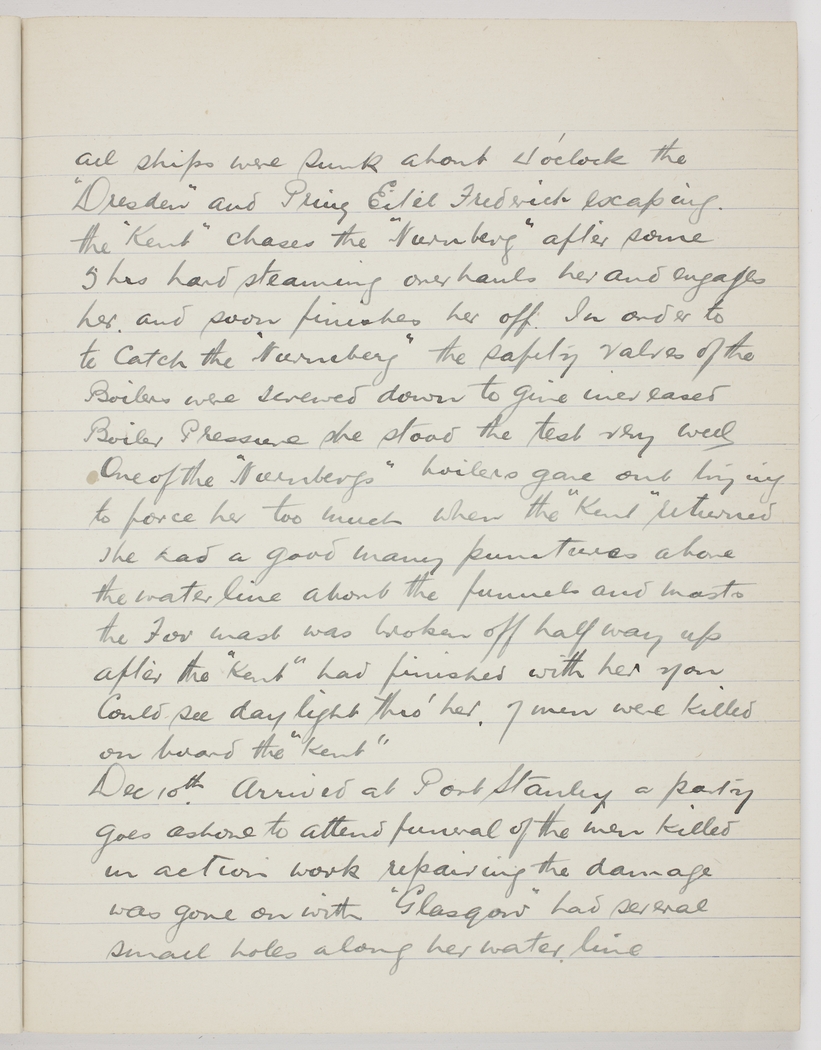 Dec 10th. Arrived at Port Stanley a party goes ashore to attend funeral of the men killed in action work repairing the damage was gone on with "Glasgow" had several small holes along her water line.