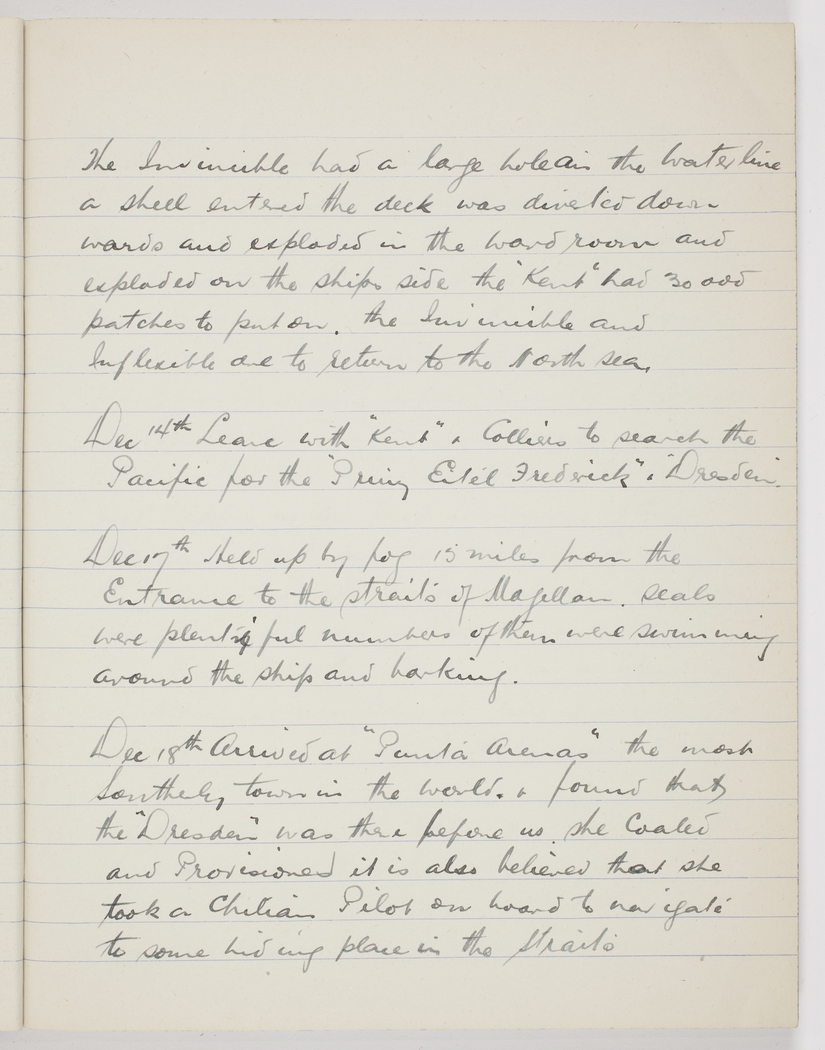 Dec 18th Arrived at "Punta Arenas" the most Southerly town in the world & found that the "Dresden" was there before us. she Coaled and Provisioned it is also believed that she took a Chilian Pilot on board to navigate to some hiding place in the Straits