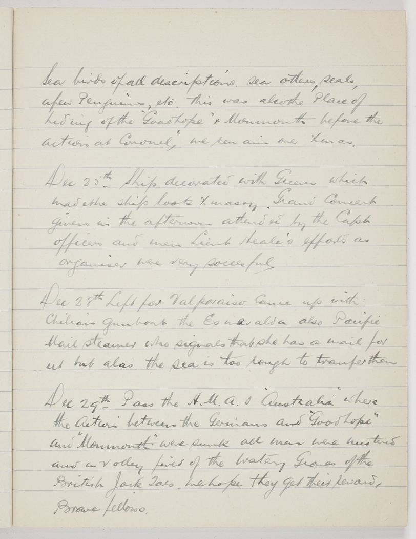 Dec 29th Pass the H.M.A.S. "Australia" where the Action between the Germans and "Goodhope" and "Monmouth" were sunk all men were mustered and a volley fired of the watery Graves of the British Jack Tars. We hope they get their rewards, Brave fellows.