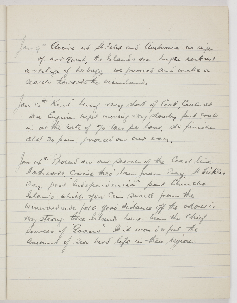 Jan 14th Proceed on our search of the Coast line Northwards. Cruise thro' San Juan Bay, St Nickolas Bay past "Indepencia" past Chincha Islands which you can smell from windward side for a good distance off the odour is very strong these Islands have been the chief sources of 'Goano" It is wonderful the sea bird life in these regions