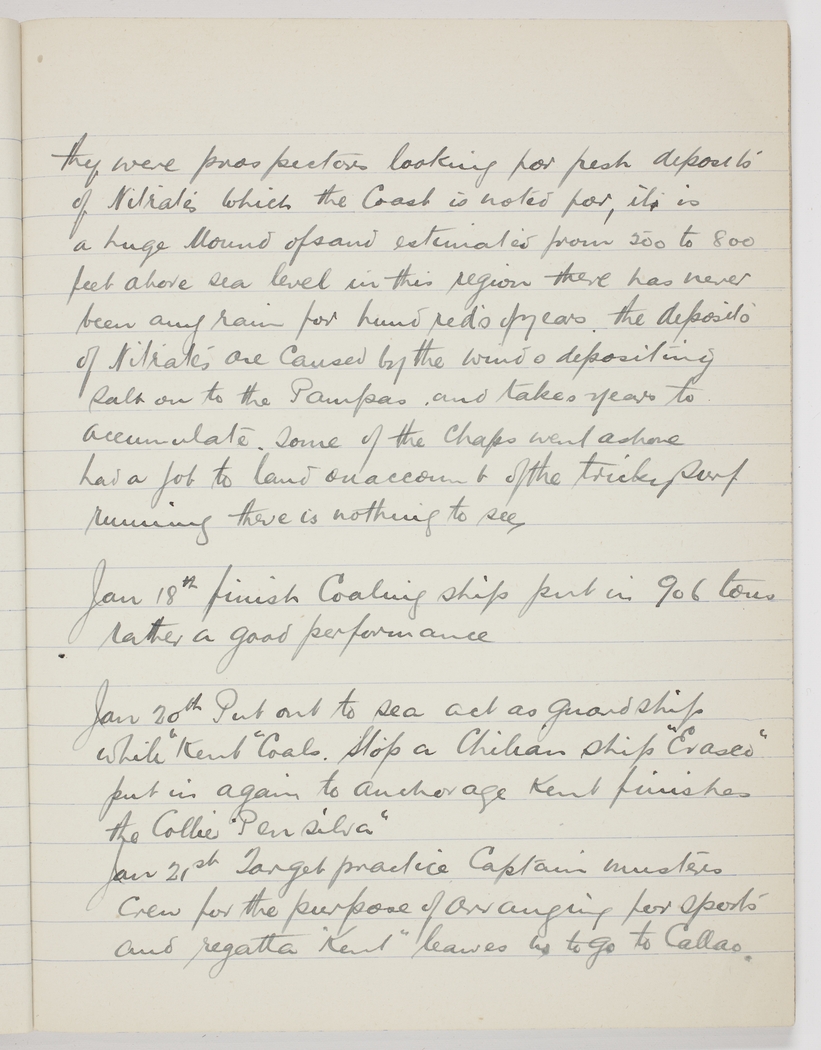 Jan 20th Put out to sea act as guard ship while "Kent" Coals. Stop a Chilian ship "Eraseo" put in again to anchorage Kent finishes the Collier "Pensilva"