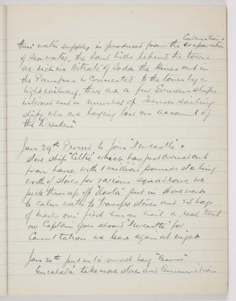 their water supply is produced from condensation & evaporation of seawater. The sandhills behind the town are rich in Nitrate of Soda the Mines out in the Pampas is connected to the town by a light railway. there are a few German ships interned and a number of French sailing ships who are laying low on account of the "Dresden"