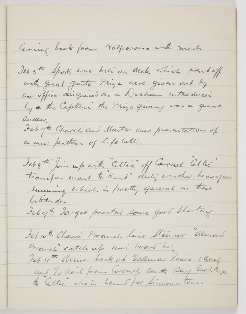 Feb 5th Sports were held on deck which went off with great gusto Prizes were given out by an officer disguised as a Duchess introduced by a the Captain the Prize giving was a great success.