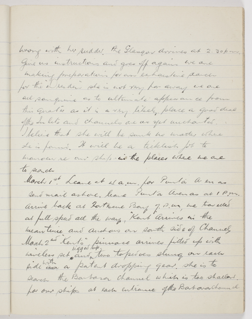 March 1st Leave at 4 a.m. for Punta Arenas send mail ashore, leave Punta Arenas at 1 p.m. arrive back at Fortescue Bay 7 p.m., we travelled at full speed all the way, "Kent" Arrives in the meantime and anchors on south side of Channel.